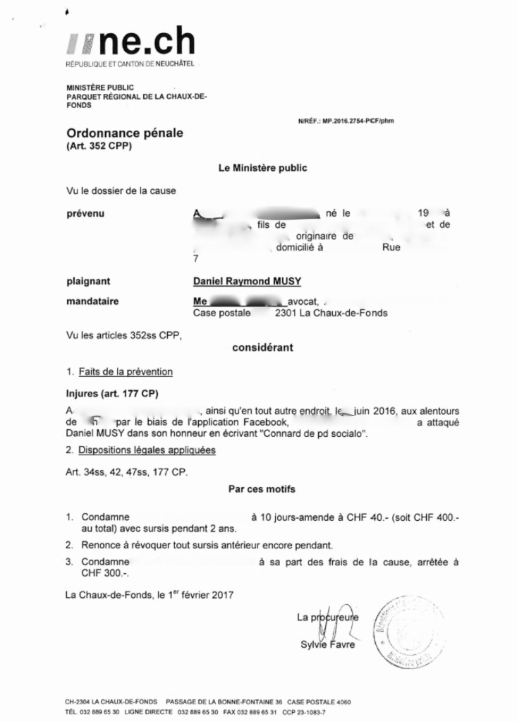 L’autre a prétexté devant la procureure qu’elle n’était pas l’auteure du commentaire car elle se serait trouvée au Togo ! Elle a été condamnée le 1er février 2017 à dix jours amende à CHF 40.- pendant 2 ans avec sursis et à CHF 300.- de frais.