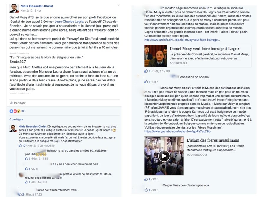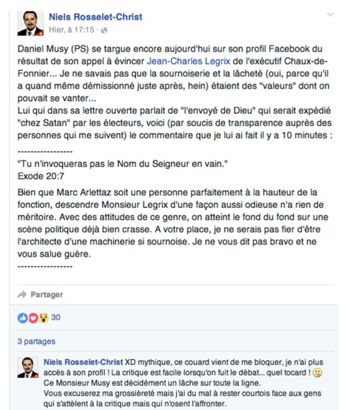 Pour éclairer davantage la personnalité de M. Rosselet-Christ, je dois expliquer qu’après la non-réélection de son ami Jean-Charles Legrix, il a mis sur FB ce post injurieux à mon égard le 8 juin 2016, deux jours après les élections communales. A l’heure actuelle, tous les principaux élu-e-s UDC de Suisse romande sont bloqué-e-s par moi sur Facebook.