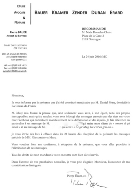 J’ai alors mandaté Me Pierre Bauer pour intimer M. Rosselet-Christ de retirer son post et pour porter plainte contre les deux internautes les plus injurieux.