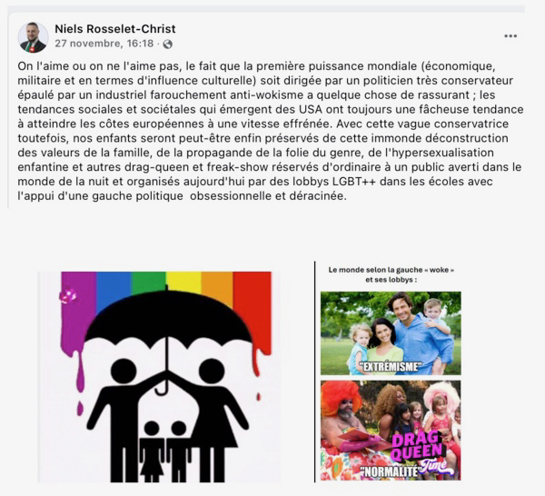 Le document ici en lien détaille comment des internautes ont réagi et comment, lui, a répondu. On retiendra que pour lui, « l’extrémisme, c’est normaliser une réthorique haineuse, raciste et sexiste à l’égard des hommes hétérosexuels et de peau blanche qu’on accuse de tous les maux de la planète ».