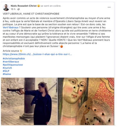 Tout récemment, il s’en est pris à un des partis qu’il déteste sûrement le plus, les Vert’libéraux. Il revendique « la tolérance et le vivre-ensemble » pour stigmatiser une élue zurichoise, Sanja Ameti, qui a commis une grosse erreur de gamine en prenant pour cible une image de Vierge Marie lors d’un exercice dans un stand de tir.