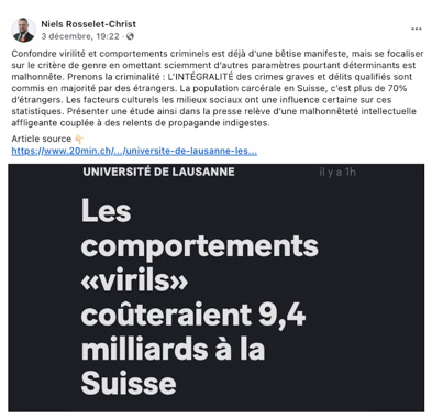 Monsieur Nils Rosselet-Christ, comme son collègue argovien Andreas Glarner ou son ancien collègue Oskar Freysinger, est un adepte de la stigmatisation gratuite destinée à galvaniser ses troupes. Croit-il, lui le bon croyant !
