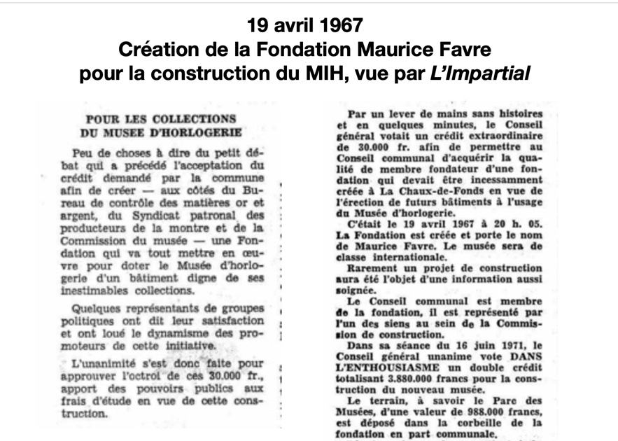 En 1967, le président du Musée d’horlogerie, Pierre Imhof, obtient enfin la création de la Fondation Maurice Favre dont le but est précisément « d’ériger […] les bâtiments et installations nécessaires à la mise en valeur et au développement des collections ». Cette dernière, dotée d’un capital initial de Fr. 100’000.-, réunit les représentants de la Commune, du Bureau de contrôle, du Syndicat patronal et du Musée. Le Contrôle s’engage alors à verser une somme d’un million et le Syndicat patronal d’un demi-million.