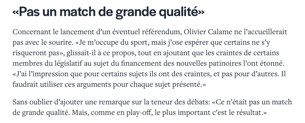 Et merci à la gauche chaux-de-fonnière d’avoir, avec les partis du centre de droite, soutenu majoritairement ces nouvelles patinoires avec la contrainte ci-dessus.