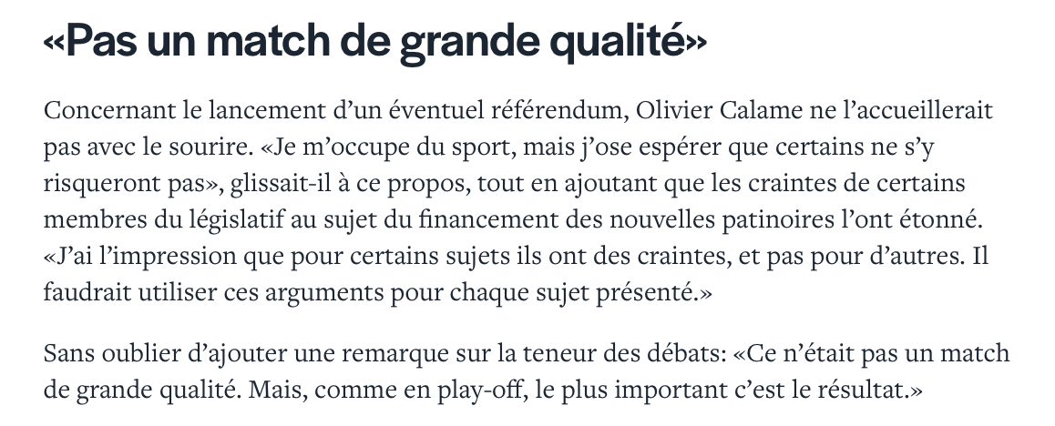 Et merci à la gauche chaux-de-fonnière d’avoir, avec les partis du centre de droite, soutenu majoritairement ces nouvelles patinoires avec la contrainte ci-dessus.