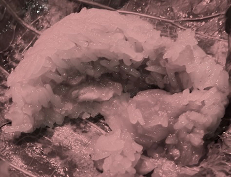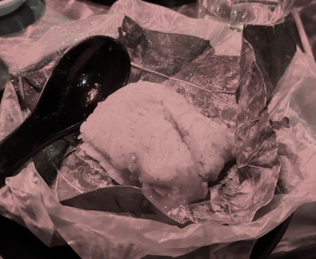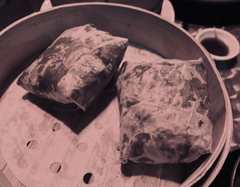 Puis sont arrivées, toujours cuites à la vapeur, deux feuilles de lotus contenant du riz gluant farci de poulet, le Lo Mai Gai. Je ne vous dis pas l’onctuosité de ce mets, comme porté par l’odeur végétale du lotus.