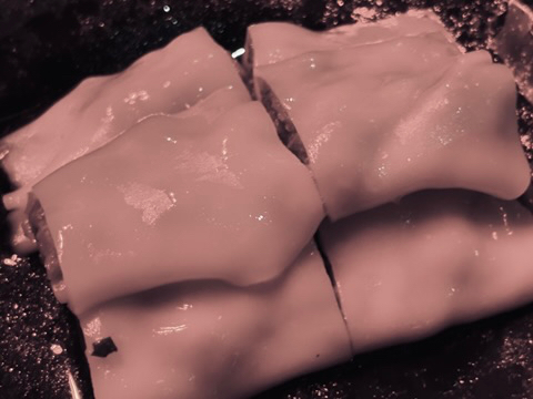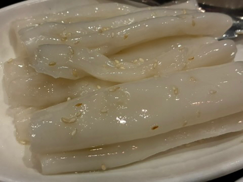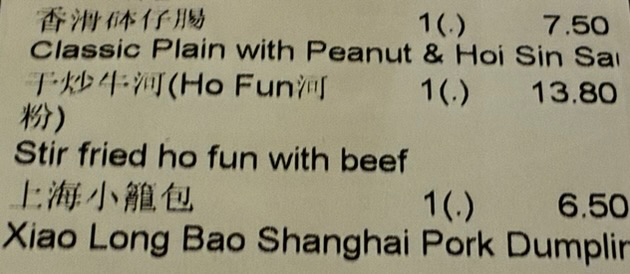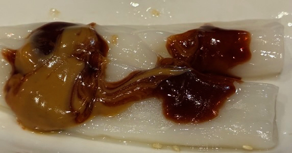 Puis j’ai essayé un chee chong fun, rouleau de nouilles de riz, accompagné de deux sauces à part avec lesquelles on recouvre les rouleaux. La première était aux cacahuètes, la seconde élaborée à partir de fèves de soja fermentées, d’ail, de vinaigre, de piment et de sucre (hoi sin sauce). La fadeur du rouleau est sublimée par ce mélange aigre-doux original.