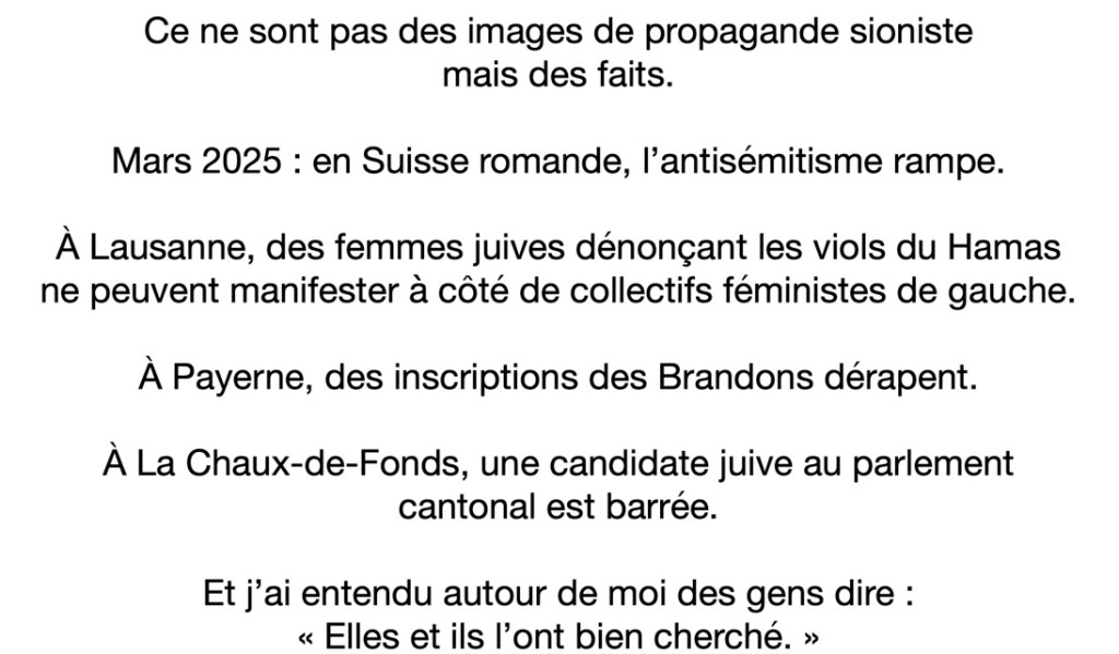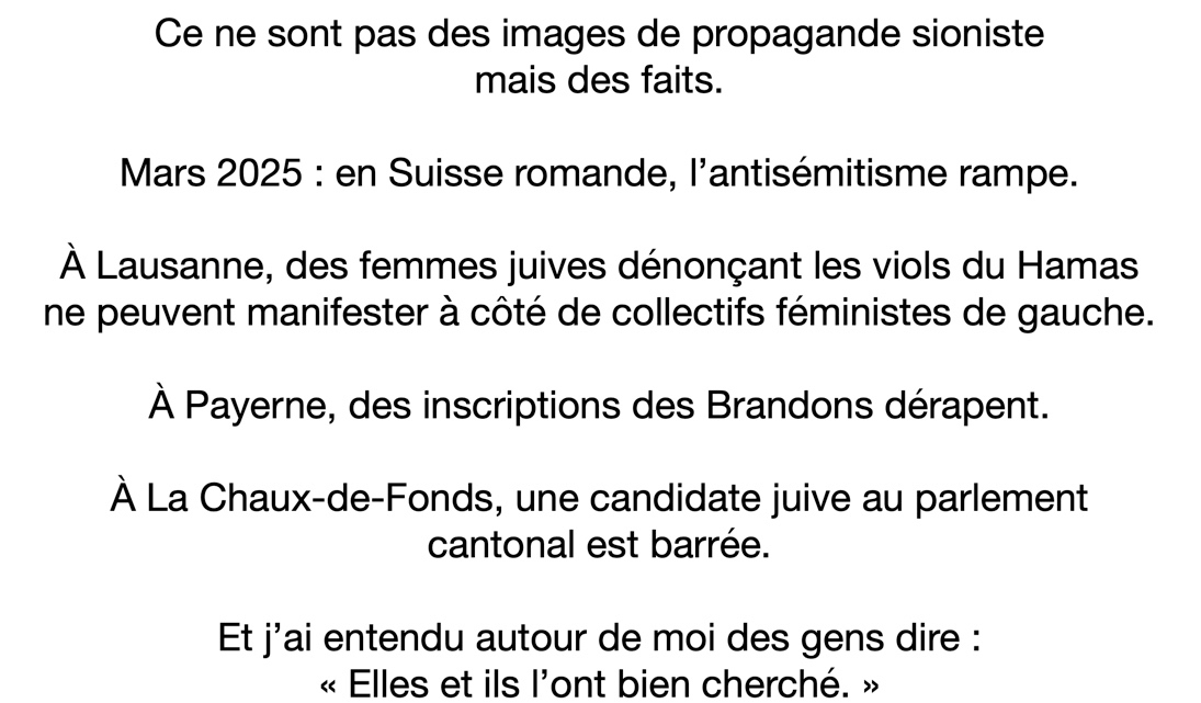 Ce 17 mars 2025 faisait suite à une série d’actes antisémites, explicites ou larvés, qui eurent lieu en Suisse romande.