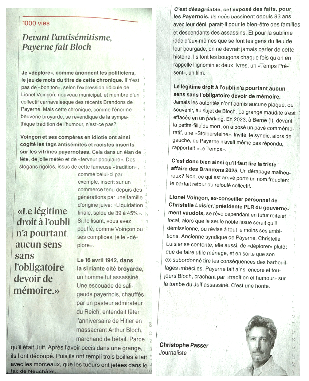 Le 17 mars 2025, dans la Grande Salle Pierre Boulez de la Philharmonie de Paris, la basse russe Dmitry Belosselskiy, le Chœur du Philharmonia de Londres et l’Orchestre National de Lille dirigés par Joshua Weilerstein ont interprété la 13e Symphonie de Dimitri Chostakovitch. Son premier mouvement est un plaidoyer contre l’antisémitisme. Ses cinq mouvements mettent en musique cinq poèmes d’Evgueni levtouchenko. Ce fut un concert mémorable en ce mois de mars 2025 où des actes antisémites explicites ou larvés se sont propagés en Suisse romande et dans notre ville.