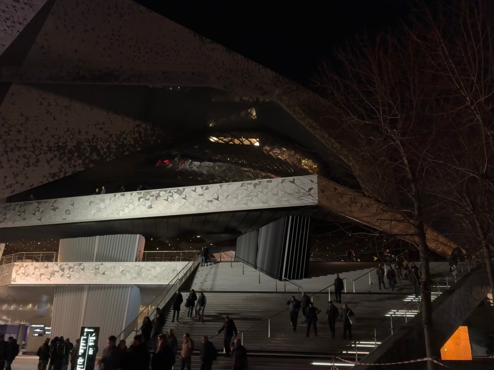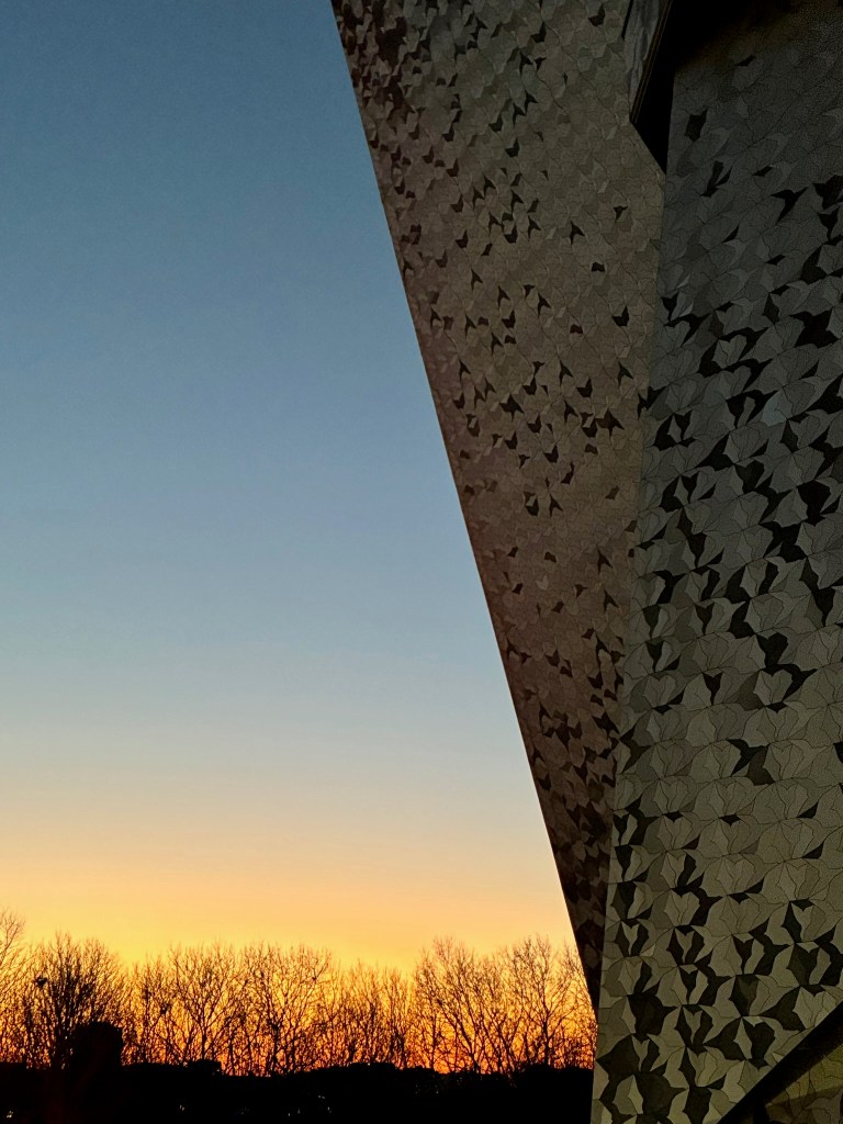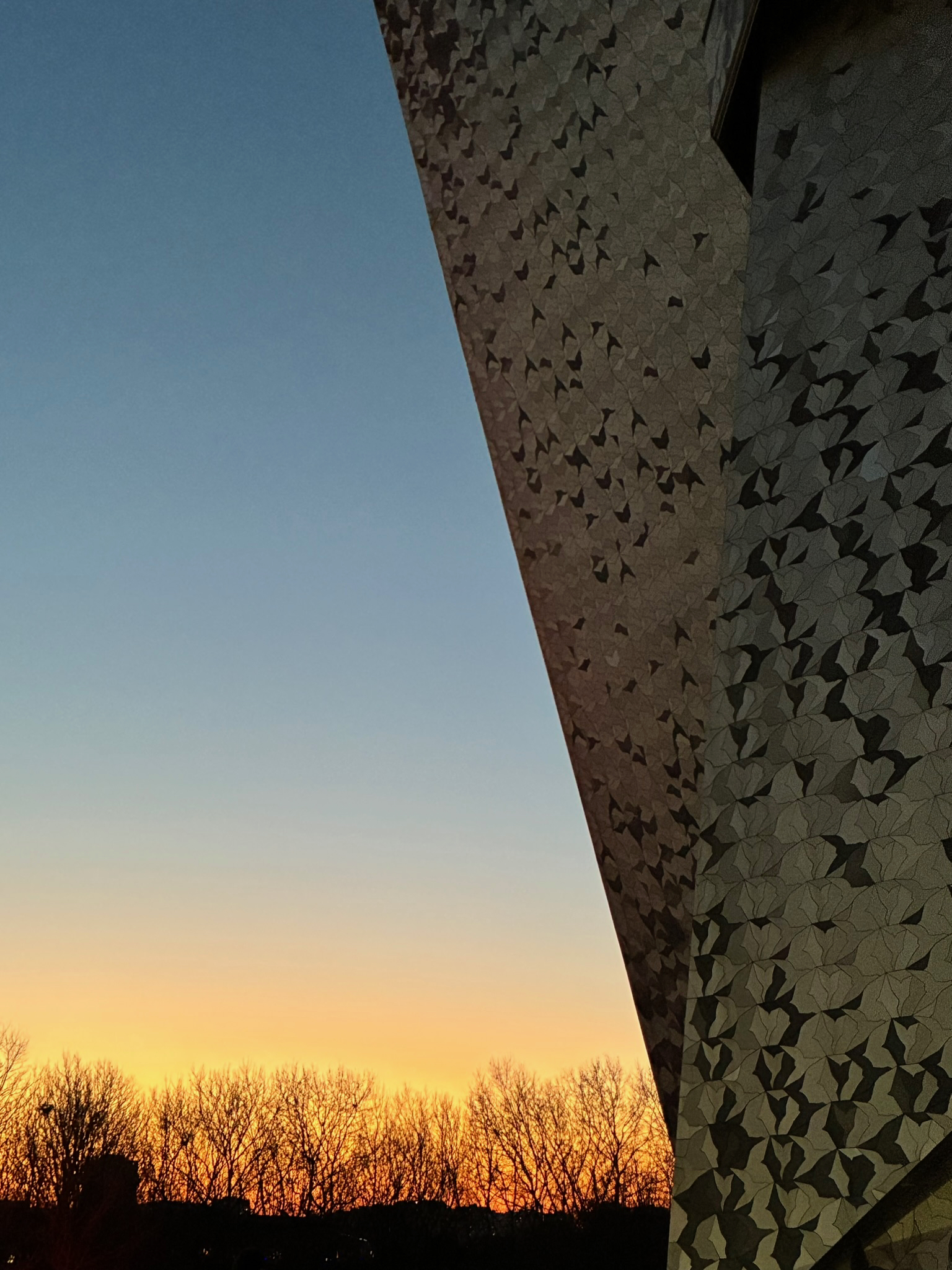 Arrivée au crépuscule à la Philharmonie construite par Jean Nouvel
