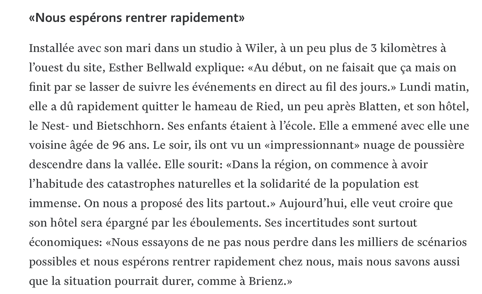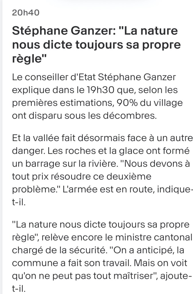 Nous ici qui pourrions, à juste titre, pleurer nos arbres mal élagués, nous devrions réserver nos larmes et nos combats futurs pour Blatten. Et pour l’avenir de la planète dans des régions exposées par les bouleversements climatiques.