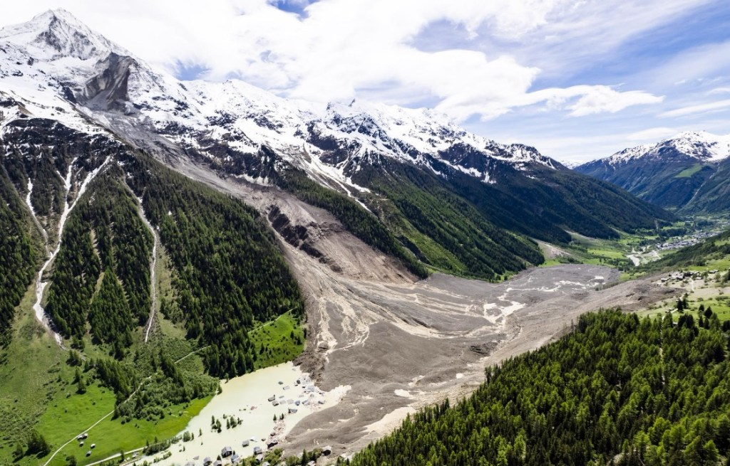 En-dessous de la photo de droite se trouve Blatten, le village central de la vallée. Les chalets supérieurs sont intacts mais les maisons en bas (visibles sur la photo de droite plus bas, prise le 21 octobre 2018) ont été recouvertes par la lave venant de la montagne en face.