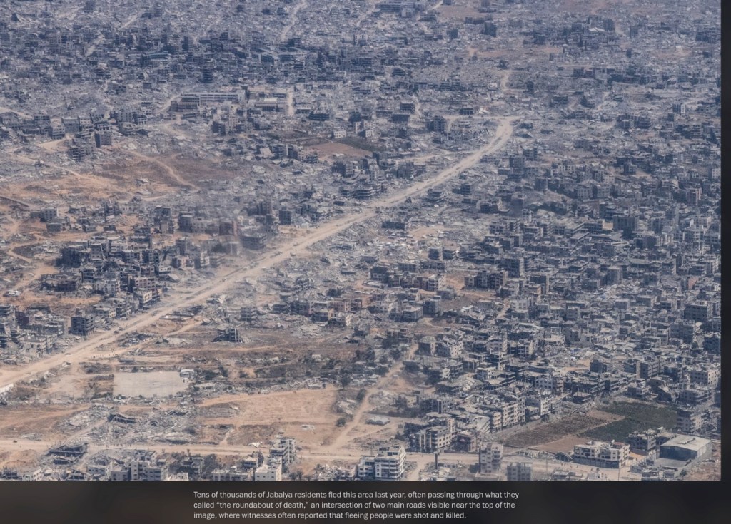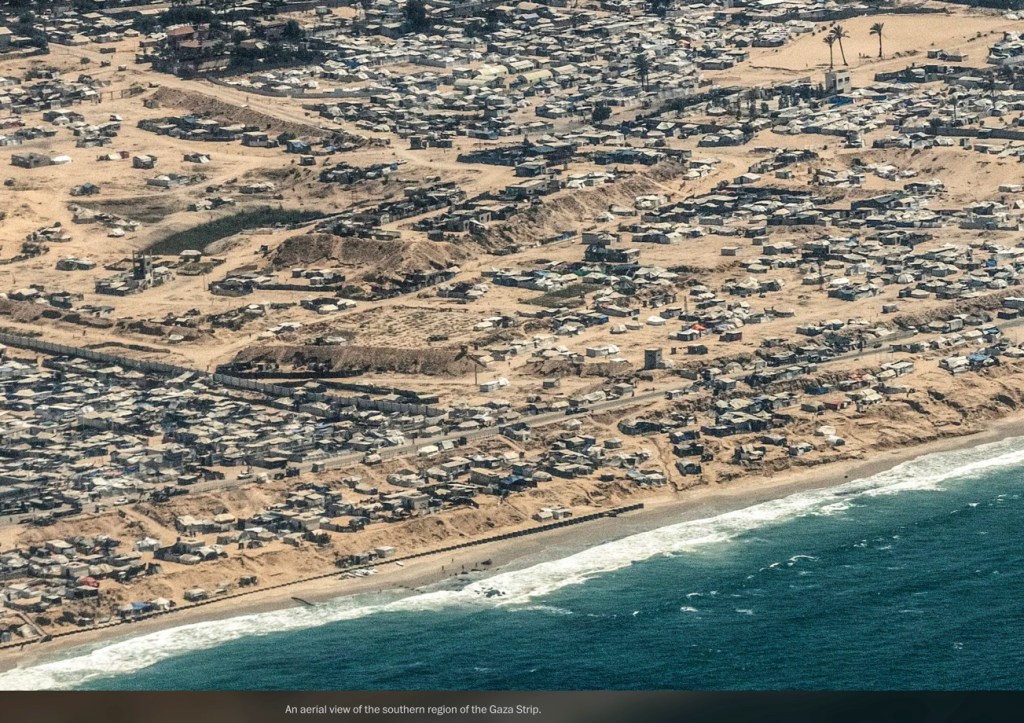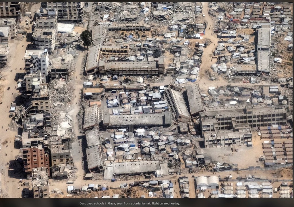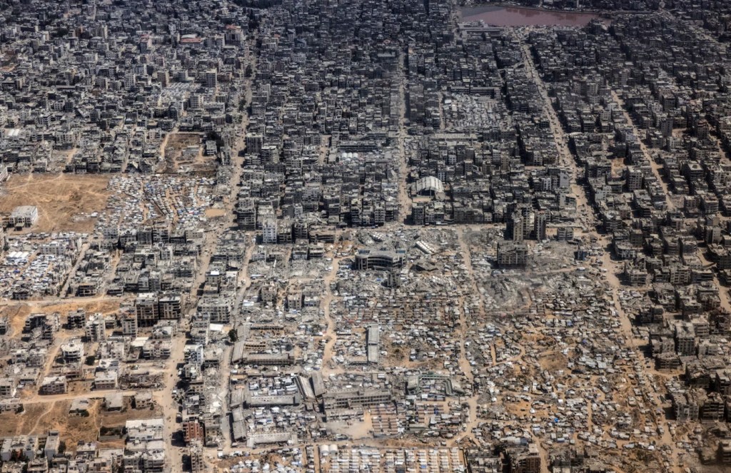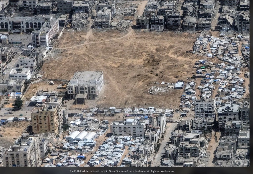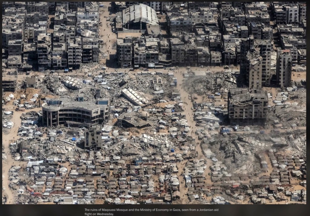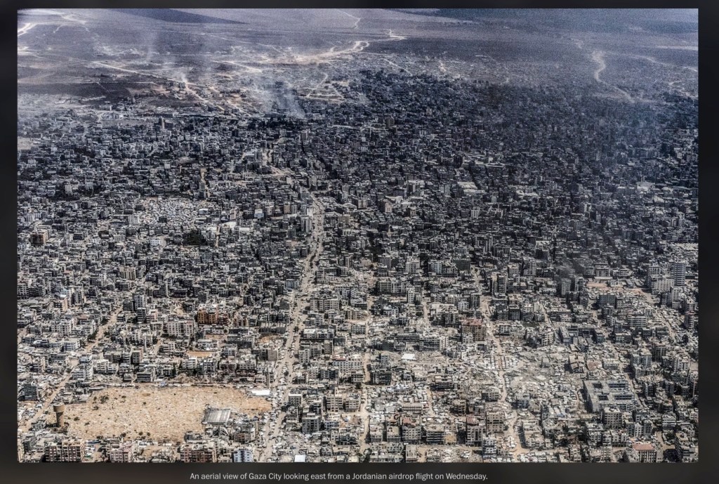 C’est une photo publiée le 2 août 2025 par le Washington Post, prise la veille par la reporter de guerre Heidi Levine, depuis un avion jordanien larguant de l’aide. On y voit Gaza City en ruines. Cette image a été prise clandestinement. L’armée israélienne a menacé de stopper les largages de nourriture si de telles vues étaient publiées.