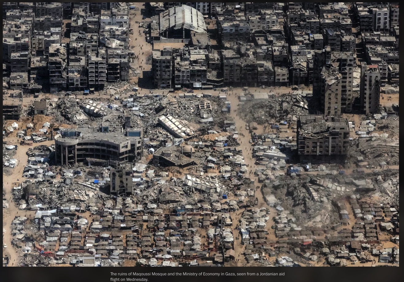 C’est une photo publiée le 2 août 2025 par le Washington Post, prise la veille par la reporter de guerre Heidi Levine, depuis un avion jordanien larguant de l’aide. On y voit Gaza City en ruines. Cette image a été prise clandestinement. L’armée israélienne a menacé de stopper les largages de nourriture si de telles vues étaient publiées.