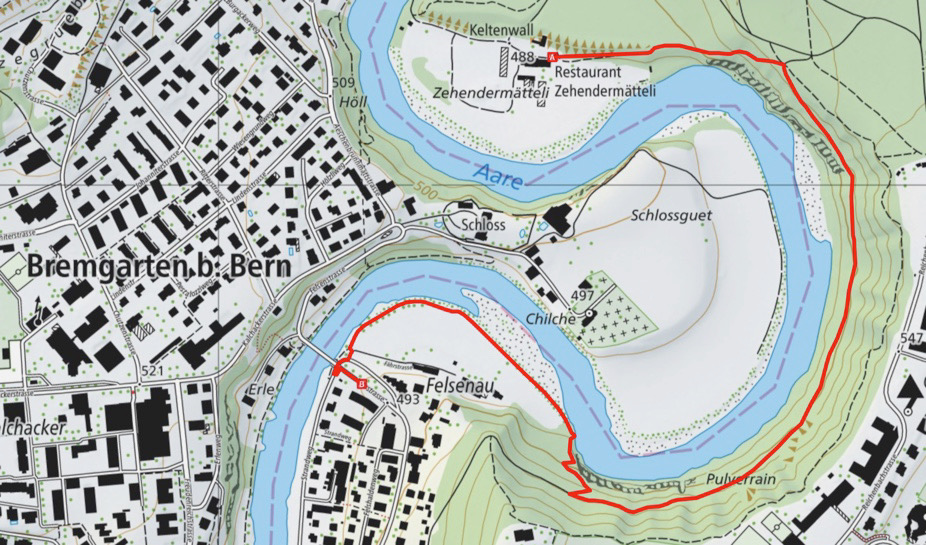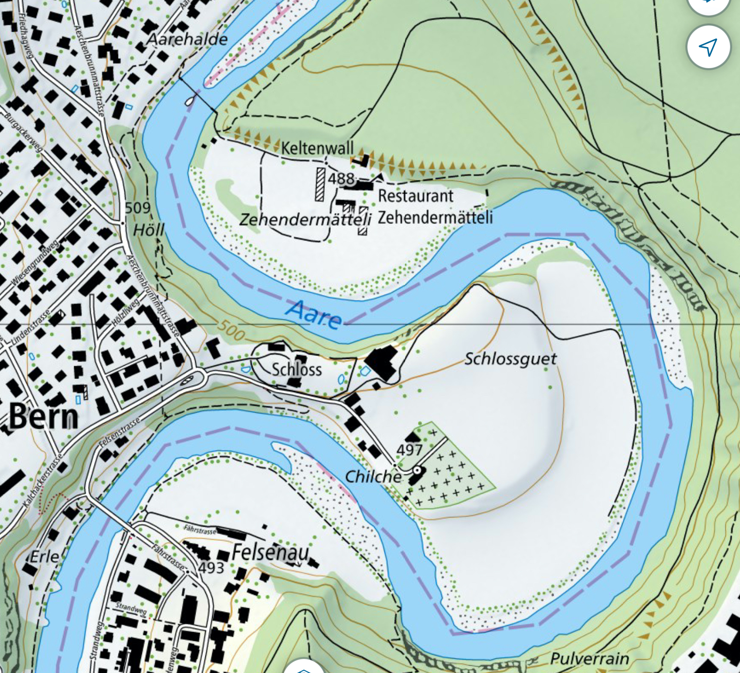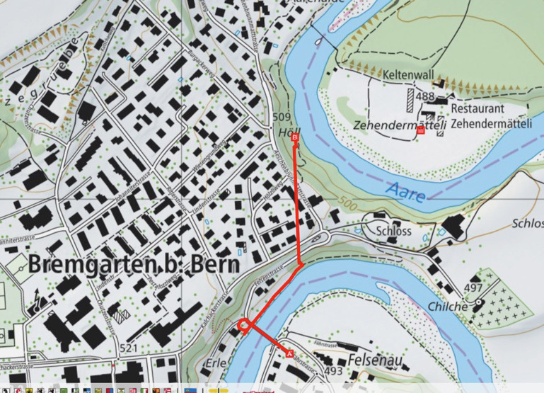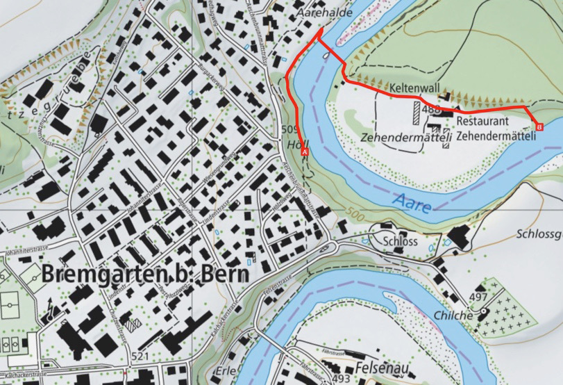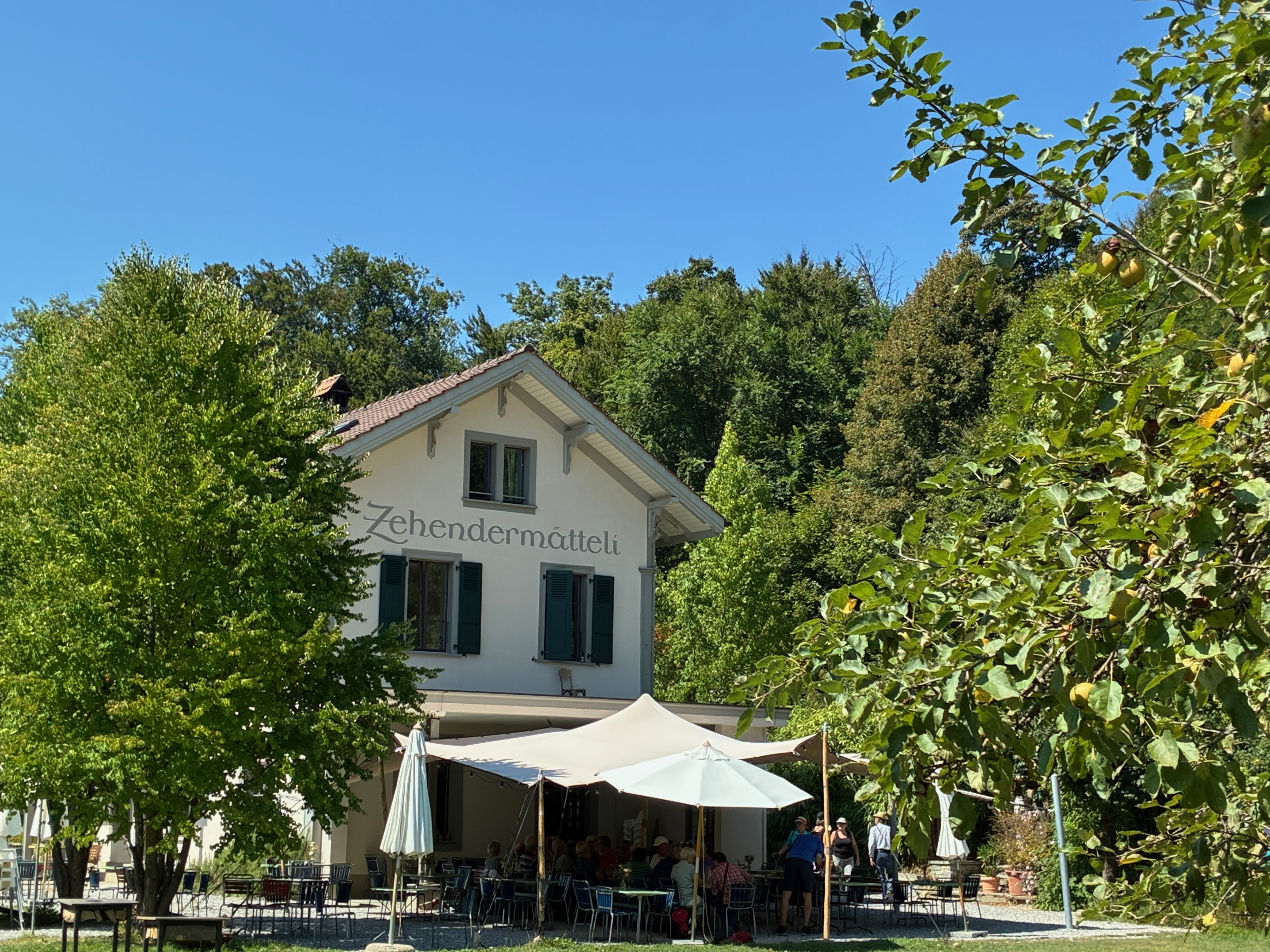 En effet, il suffira de prendre à l’est de la gare de Berne le bus 21 pour Bremgarten et s’arrêter à la Fährstrasse. De là, on traversera le pont sur l’Aar et on suivra le sentier des rives jusqu’à un tunnel qui nous mènera de l’autre côté du méandre de la rivière. Quelque 200 mètres plus loin, on sonnera pour appeler le batelier qui nous conduira sur l’autre rive. Une petite montée et voilà cette belle ferme reconvertie en café-restaurant, une institution bernoise connues des amateurs, das Zehndi.