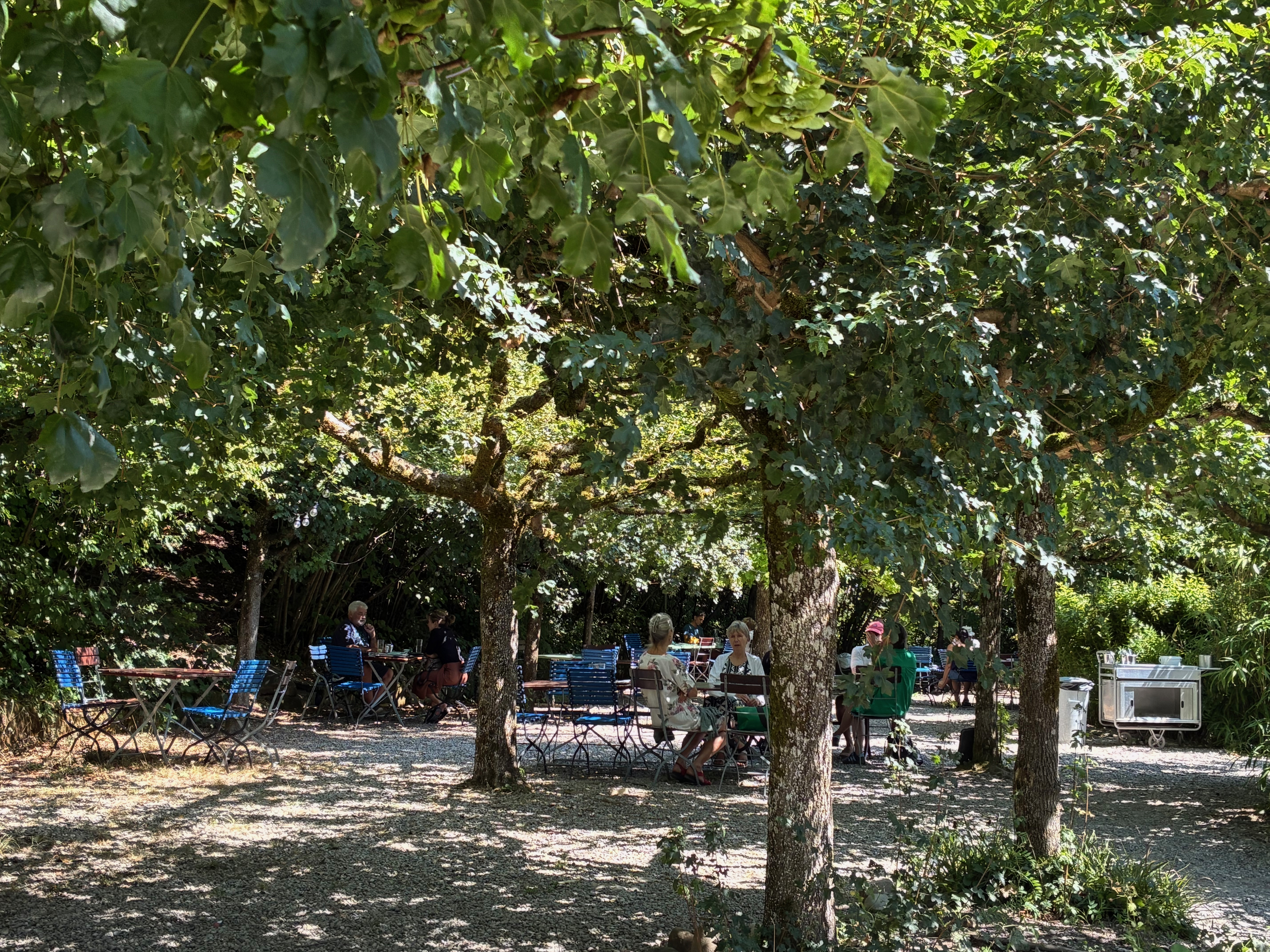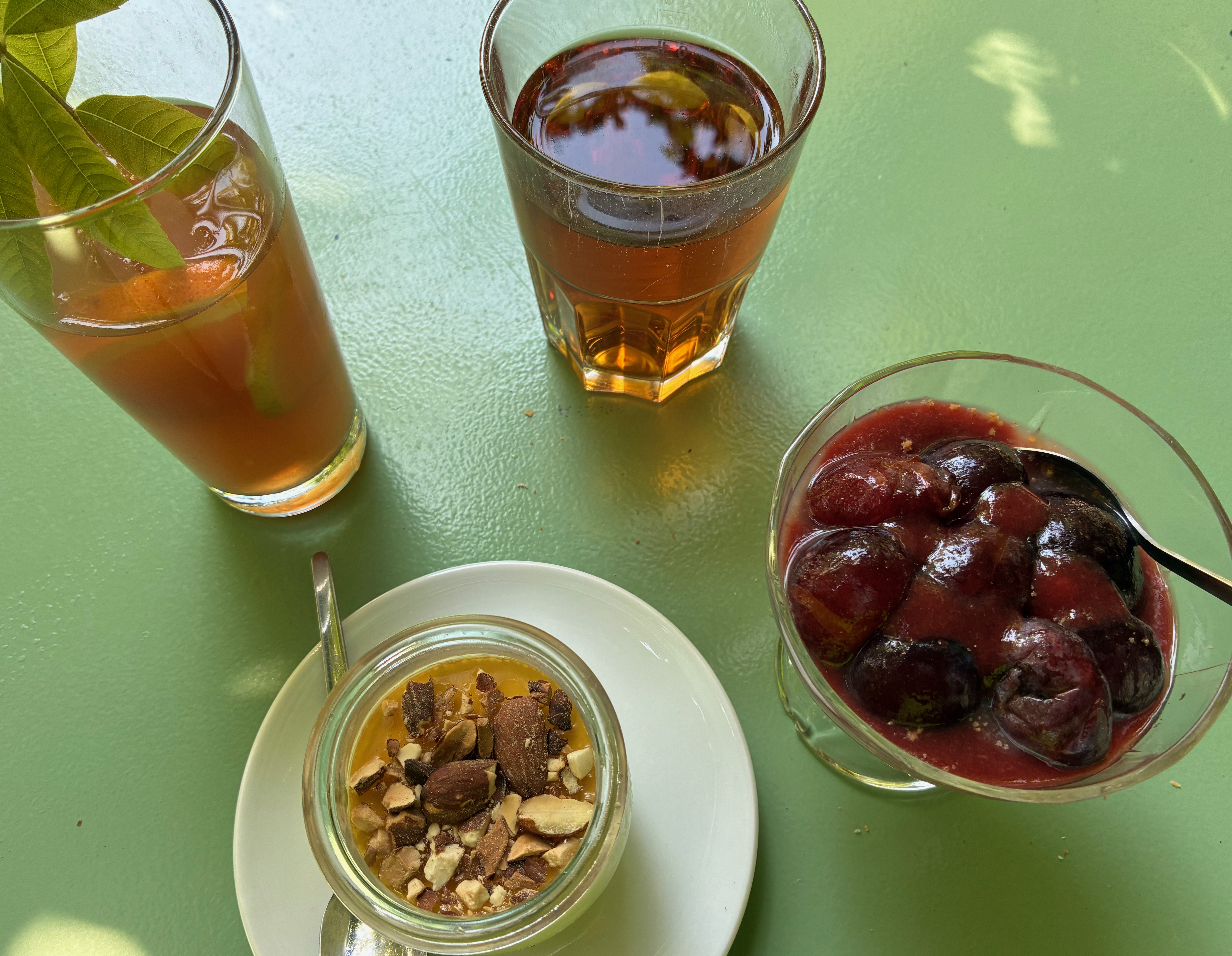 Le jardin d’été sous les arbustes est féérique : yoghourt à la turque, amandes et miel, prunes compotées au mascarpone et thé froid maison furent un petit bonheur gustatif.