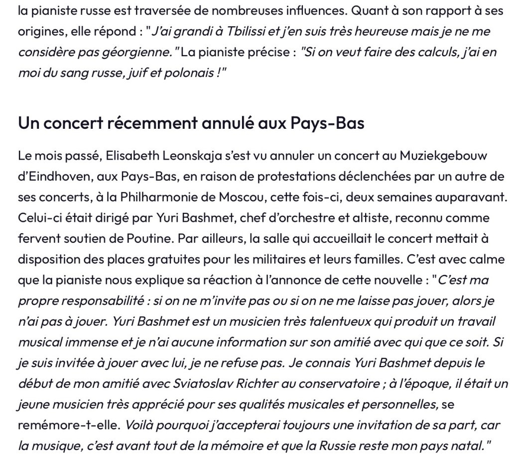 Ce 21 novembre 2025, c’est Elisabeth Leonskaja qui a donné un concert donné à la Philharmonie de Moscou, dirigé par Yuri Bashmet, altiste et chef d’orchestre qui a plusieurs fois affirmé publiquement sous soutien au président Vladimir Poutine. Et le Muziekgebouw d’Eindhoven, où la pianiste russo-autrichienne devait se produire le 4 décembre, a décidé d’annuler le concert !
