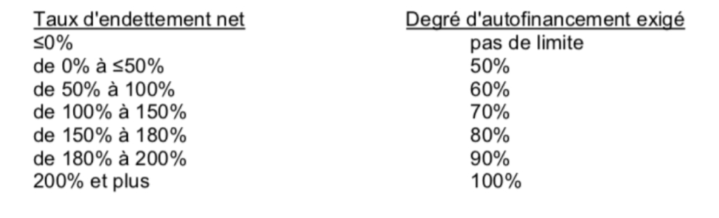 Le règlement dit ceci : « Le calcul du degré minimal d’autofinancement se base sur l’autofinancement et les investissements nets totaux. Le degré minimal d’autofinancement des investissements nets est défini en fonction du taux d’endettement net du dernier exercice clôturé, selon le tableau suivant :