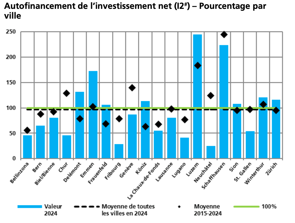 « En 2024, les villes affichent des valeurs contrastées en matière d’autofinancement de l’investissement net. Neuf villes se situent au-delà de 100% (Delémont, Emmen, Frauenfeld, Köniz, Luzern, Schaffhausen, Sion, Winterthur et Zürich). Les autres villes ne financent que partiellement leurs investissements par leurs propres moyens. Les villes de Bellinzona, Bern, Chur, Fribourg, La Chaux-de-Fonds, Lugano, Neuchâtel et St. Gallen présentent le degré d’autofinancement le plus faible, tandis que Luzern et Schaffhausen présentent les taux les plus élevés. La médiane et la moyenne se situent en dessous de 100%.»