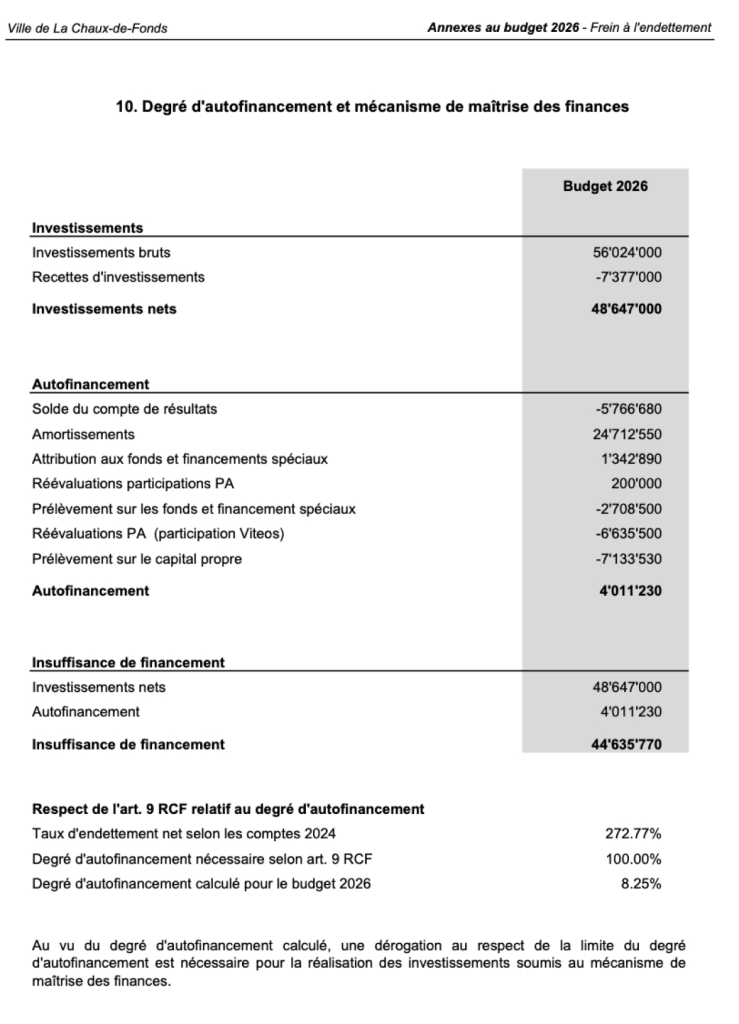 En 2021, on avait à La Chaux-de-Fonds dans les comptes un degré d’autofinancement de 42%. Il baisse à 25 % en 2022 et remonte à 43% en 2023 ! Il est en 2024 à 44 % dans les comptes. Il est budgeté à 8,25 % en 2026 (ce qui sous-entend que dans les comptes 2026, si tous les investissements votés ne sont pas effectués, ce degré d’autofinancement augmentera; c’est technique mais c’est ainsi !).