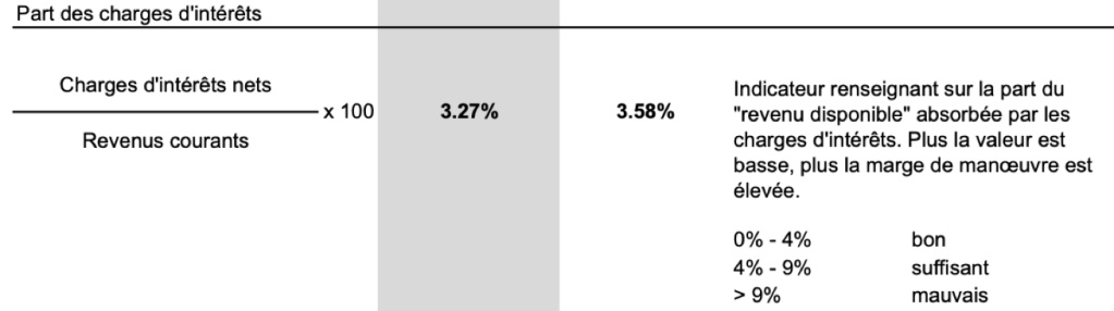 Cet indicateur renseigne sur la part des revenus fiscaux, c’est-à-dire sur le nombre de tranches annuelles d’impôts qui seraient nécessaires pour amortir la dette nette. On divise la dette nette par les revenus fiscaux et on multiplie par cent pour avoir le taux. En 2023, le taux d’endettement était de 300 %, en 2024 de 275%.