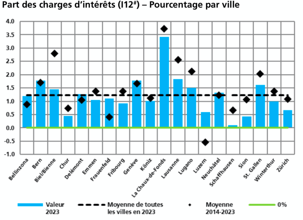 Selon l’IDEHAP, « en moyenne sur les dix dernières années, la part des charges d’intérêts se maintient au-dessous de 1% pour cinq villes: Bellinzona, Chur, Frauenfeld, Luzern (taux négatif) et Schaffhausen. En revanche, les villes de Biel/Bienne, La Chaux-de-Fonds (très en tête du négatif !)et Lausanne font face, sur cette même période, à une part supérieure à 2.5%, traduisant une hypothèque plus sensible des intérêts sur les revenus courants».