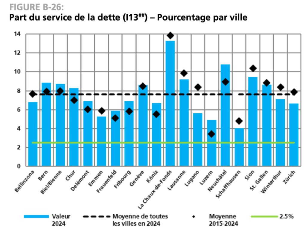 IDEHAP : « Cet indicateur mesure l’importance des charges financières qui pèsent sur le budget et les comptes. Il renseigne sur la part des revenus courants absorbée par le service de la dette (intérêts et amortissements). Un taux élevé signifie une marge de manoeuvre budgétaire plus restreinte.Les villes affichent en 2024 des résultats plutôt problématiques pour l’indicateur de la part du service de la dette. Neuf villes sont confrontées à un effet de tenailles significatif sur les revenus courants (Bern, Biel/Bienne, Chur, Genève, La Chaux-de-Fonds, Lausanne, Neuchâtel, Sion et St. Gallen.»