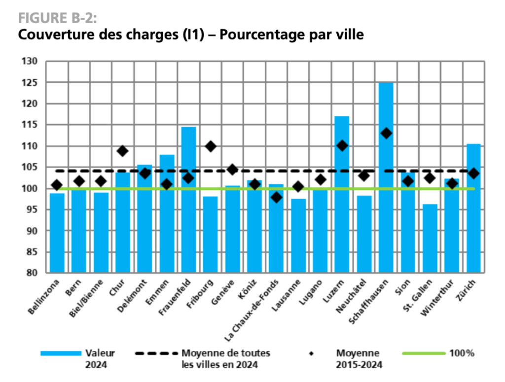 Les villes obtiennent en 2024 des résultats contrastés pour l’indicateur de couverture des charges. Quatre villes se situent au niveau idéal compris entre 100 et 103% (Genève, Köniz, La Chaux-de-Fonds et Winterthur).»