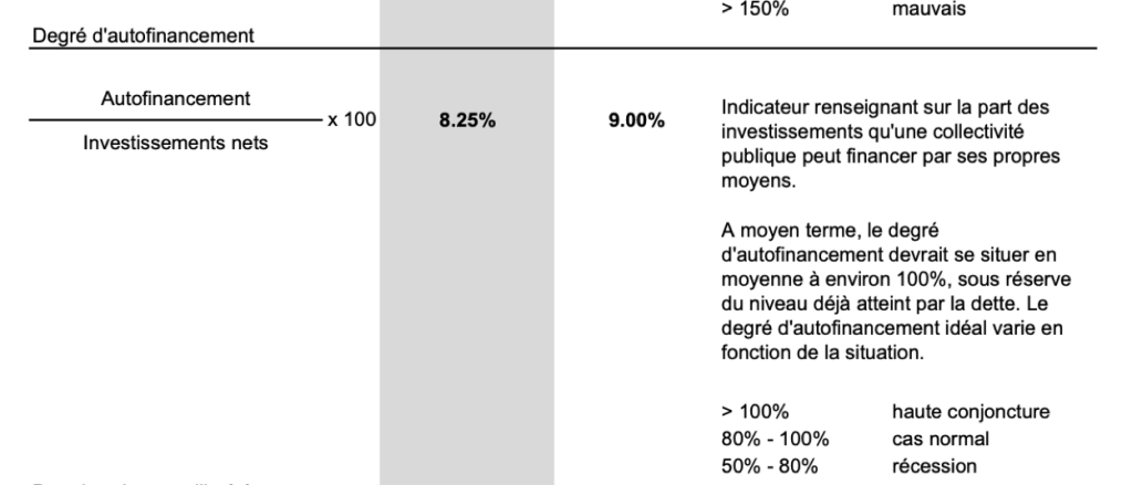 IDEHAP : « Cet indicateur renseigne sur la proportion du revenu que la collectivité publique peut consacrer au financement de ses investissements. Au-dessous de 10 % c’est mauvais. Le taux d’autofinancement informe sur la part des revenus courants qui reste en main de la collectivité pour (auto)financer par elle-même ses investissements. Autrement dit, il indique dans quelle mesure les revenus peuvent être épargnés plutôt que consacrés à financer les charges courantes. »