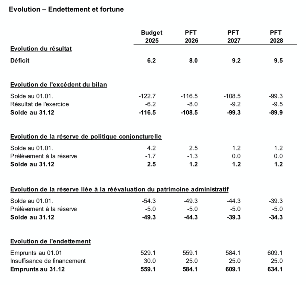 Grâce à deux réserves, la réserve de la politique conjoncturelle et celle liée à la réévaluation du patrimoine administratif, les déficits du chaque budget sont compensés partiellement. En 9 ans, la fortune permettant à la Ville de puiser dans ces deux réserves a diminué de plus de 80 millions ; il reste une marge de manœuvre de 44 mio en 2026 et de presque 34 mio en 2027 selon les projections mêmes de la Ville.