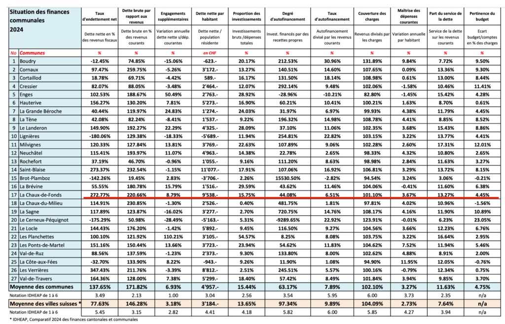 « En 2024, les villes affichent, à peu d’exceptions près, des résultats bons à très bons pour le taux d’autofinancement. Dix villes présentent un taux égal ou supérieur à 8%, ce qui est un excellent résultat : Chur, Delémont, Emmen, Frauenfeld, Köniz, Luzern, Schaffhausen, Sion, Winterthur et Zürich. La ville de Neuchâtel présente la valeur la plus basse, et témoigne d’un taux d’autofinancement insuffisant. La médiane et la moyenne se situent à un très bon niveau.» Notre ville ne s’en tire pas vraiment bien dans ce tableau comparatif !