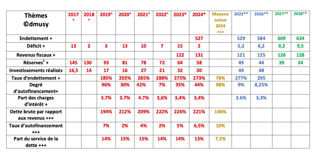 En rouge dans ce tableau exclusif et non reproductible sans autorisation, les chiffres réels des comptes 2017-2024. En bleu, les chiffres budgétés. En vert, les hypothèses fournies par le Conseil communal dans ses documents BUDGET 2026. En ocre, la moyenne suisse 2024.