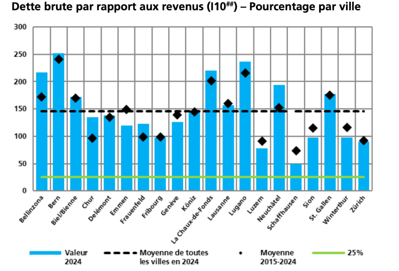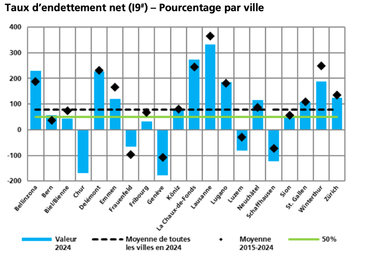 Selon l’IDEHAP, en 2024, les villes « affichent des taux d’endettement net très contrastés. Cinq villes obtiennent un taux négatif, c’est-à-dire qu’elles disposent d’actifs nets : Chur, Frauenfeld, Genève, Luzern et Schaffhausen. Les villes de Bellinzona, Delémont, La Chaux-de-Fonds, Lausanne, Lugano, Winterthur et Zürich présentent des taux d’endettement problématiques, voire très problématiques.»