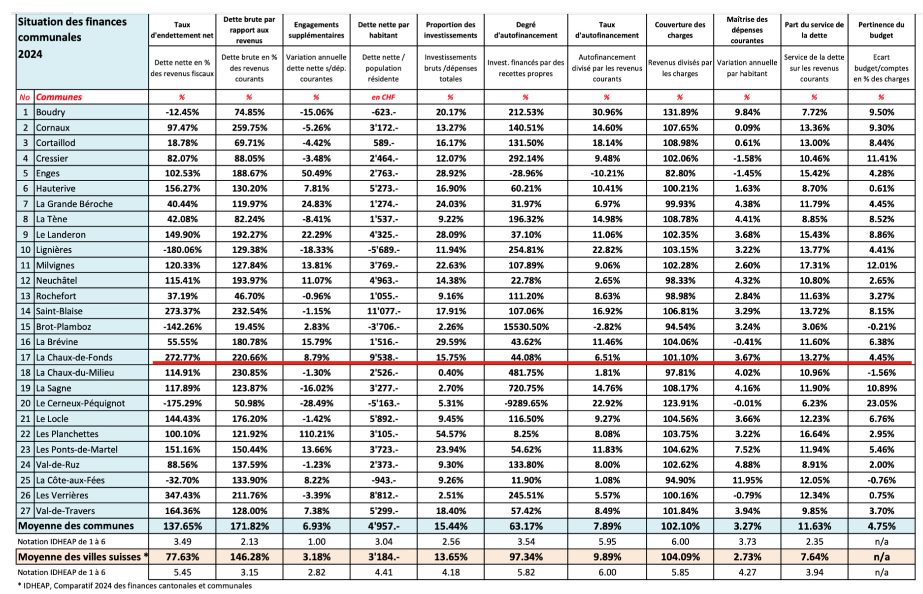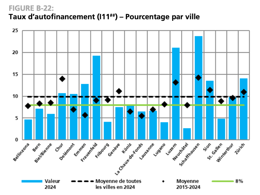 « En 2024, les villes affichent, à peu d’exceptions près, des résultats bons à très bons pour le taux d’autofinancement. Dix villes présentent un taux égal ou supérieur à 8%, ce qui est un excellent résultat : Chur, Delémont, Emmen, Frauenfeld, Köniz, Luzern, Schaffhausen, Sion, Winterthur et Zürich. La ville de Neuchâtel présente la valeur la plus basse, et témoigne d’un taux d’autofinancement insuffisant. La médiane et la moyenne se situent à un très bon niveau.» Notre ville ne s’en tire pas vraiment bien dans ce tableau comparatif !