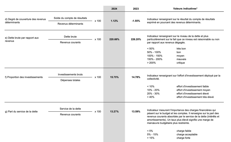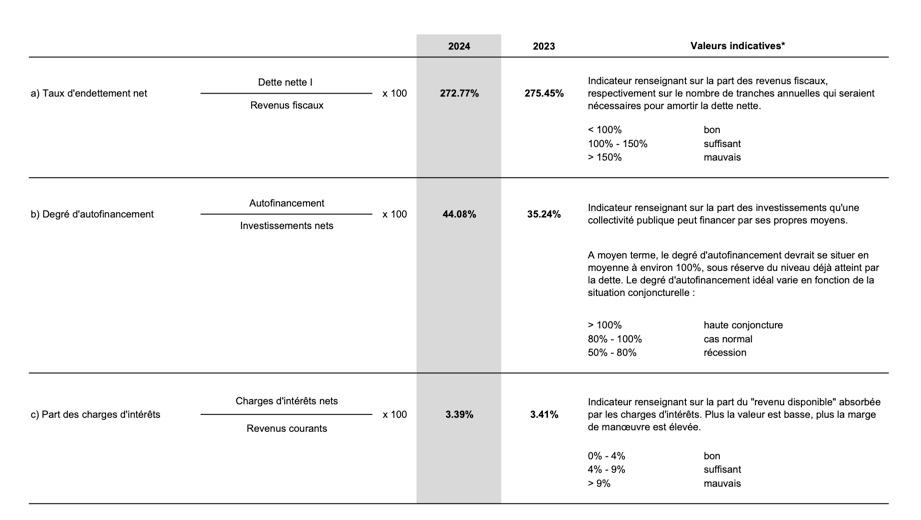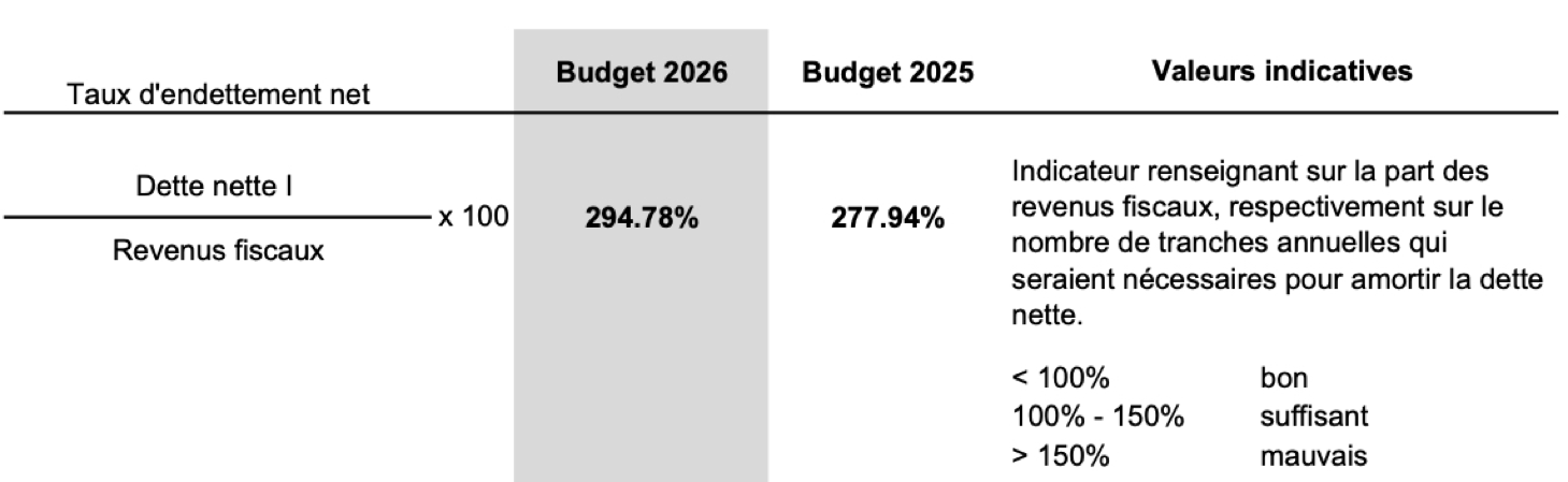 Cet indicateur renseigne sur la part des revenus fiscaux, c’est-à-dire sur le nombre de tranches annuelles d’impôts qui seraient nécessaires pour amortir la dette nette. On divise la dette nette par les revenus fiscaux et on multiplie par cent pour avoir le taux. En 2023, le taux d’endettement était de 300 %, en 2024 de 275%.