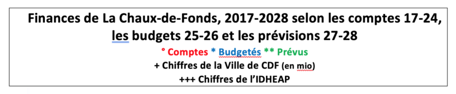 En rouge dans ce tableau exclusif et non reproductible sans autorisation, les chiffres réels des comptes 2017-2024. En bleu, les chiffres budgétés. En vert, les hypothèses fournies par le Conseil communal dans ses documents BUDGET 2026. En ocre, la moyenne suisse 2024.