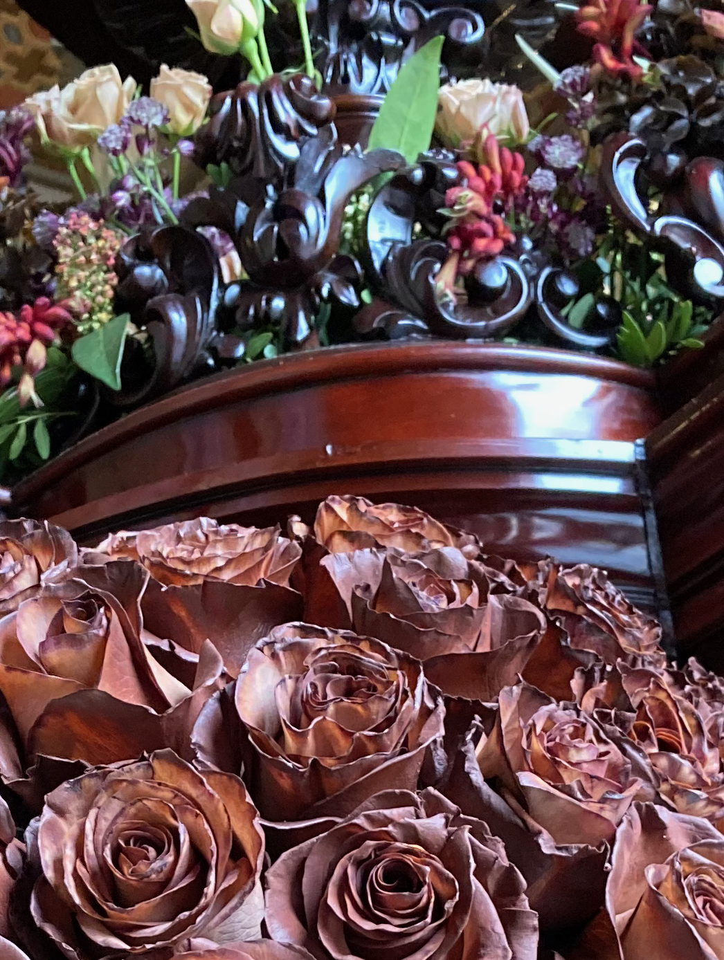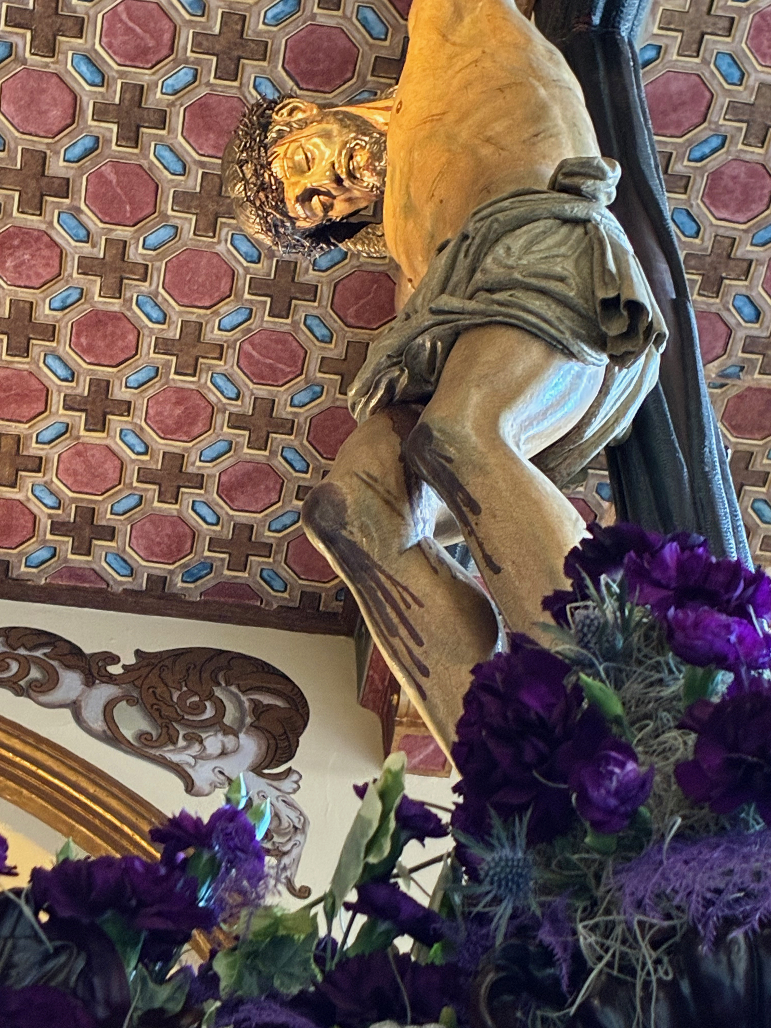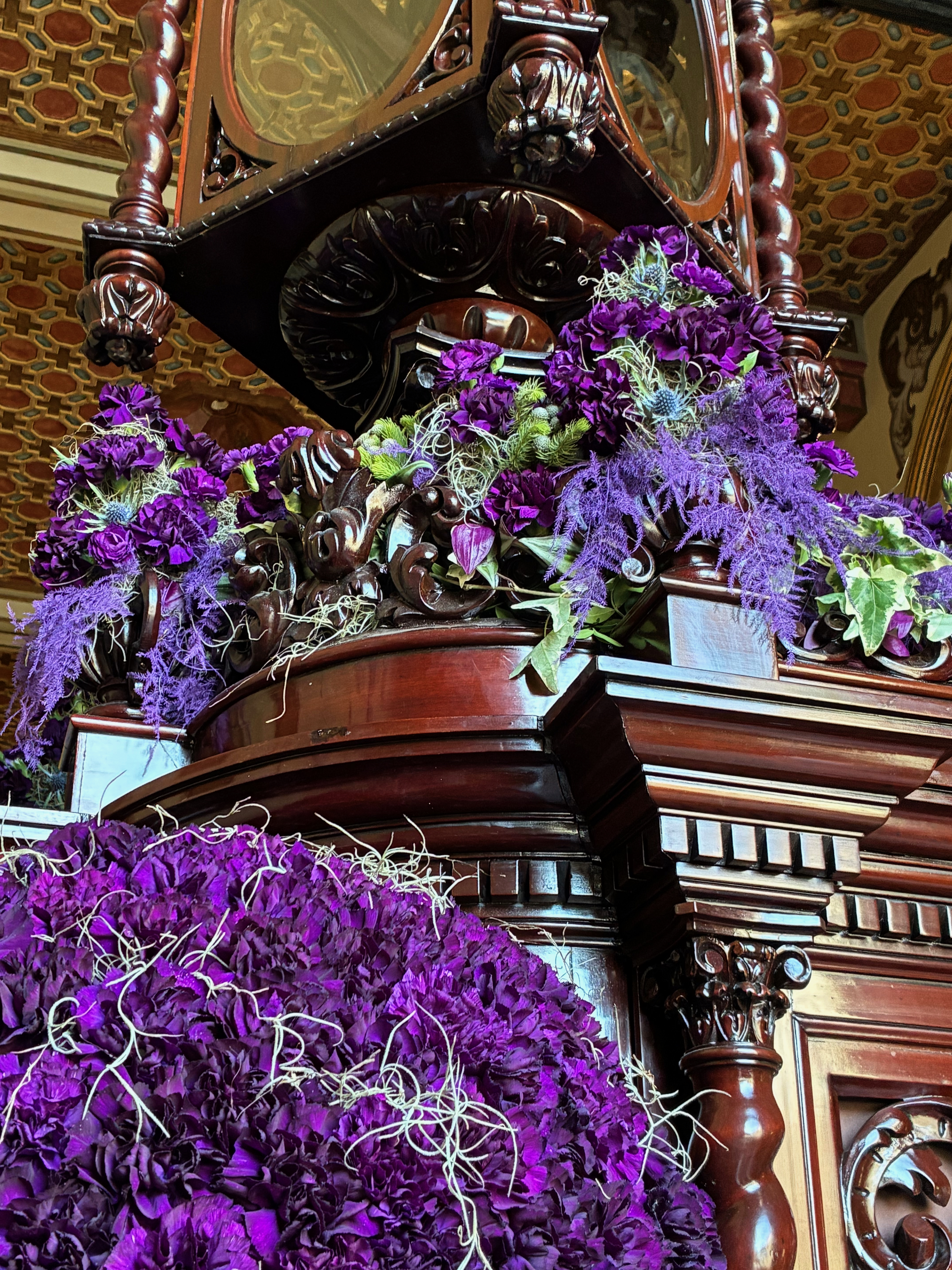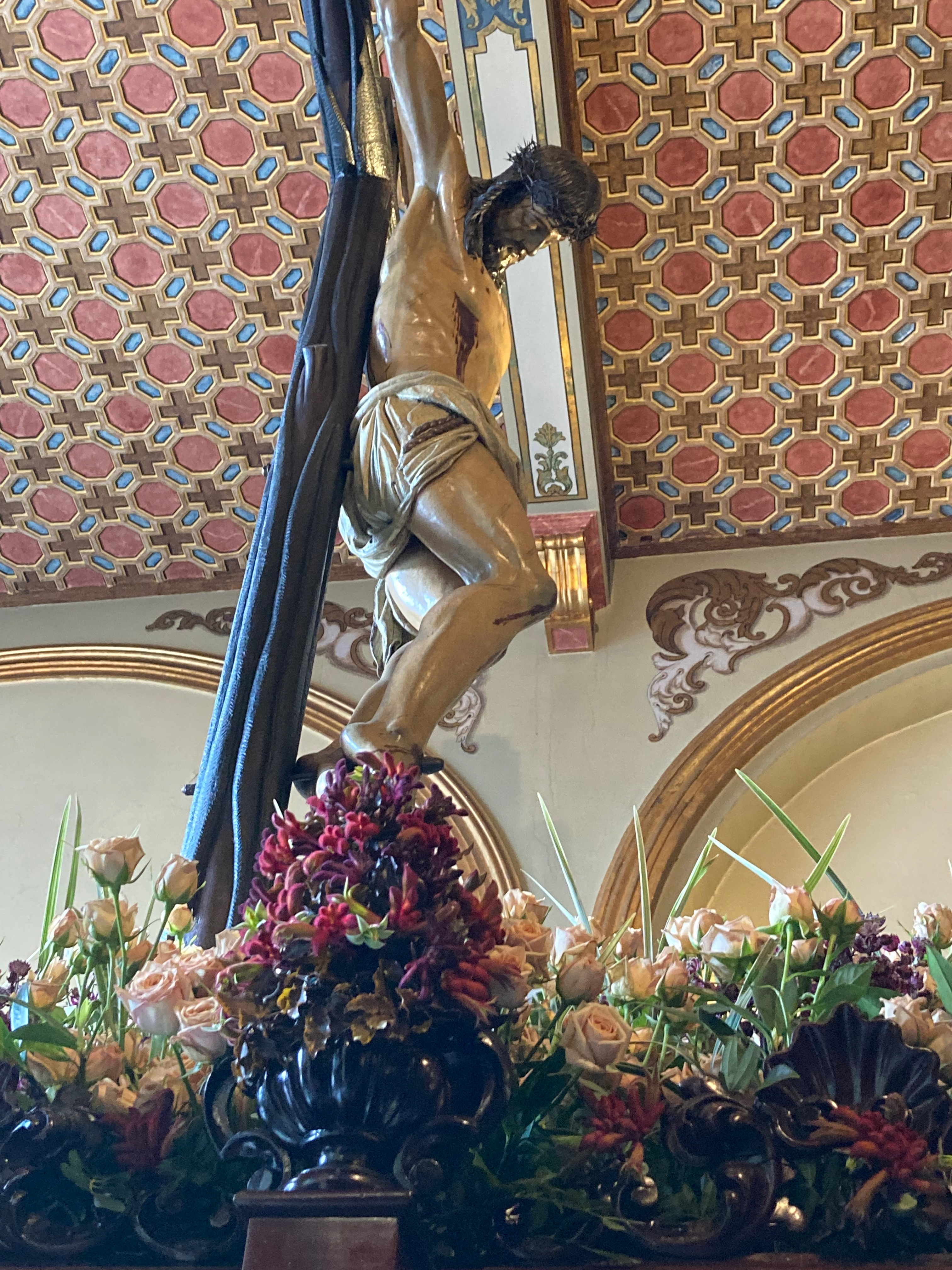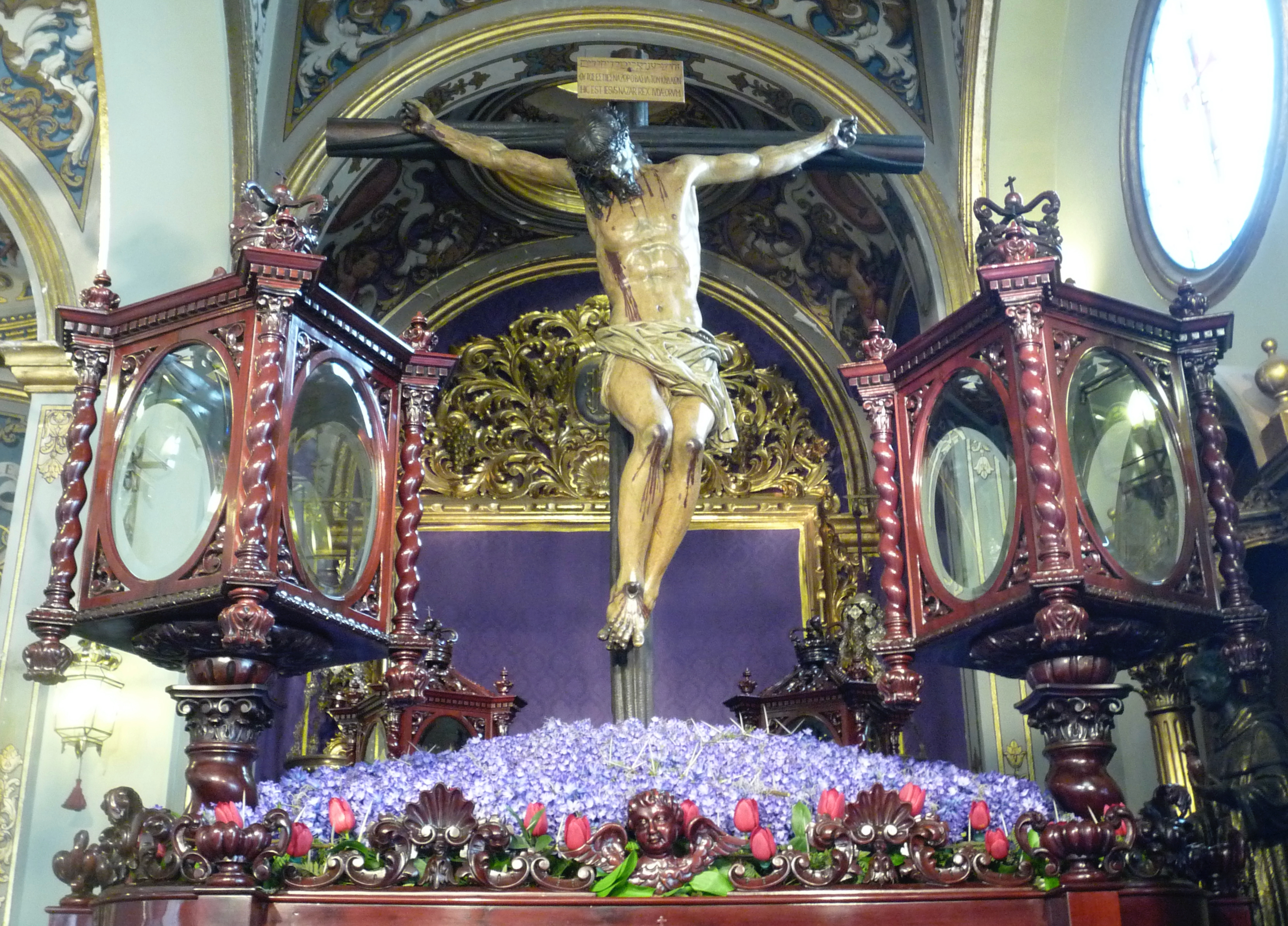 Chaque année, la décoration florale des bords et des angles du paso est différente la couleur de sa surface horizontale est le rouge ou le violet (clair ou foncé) de la passion. De gauche à droite : 2014, 2024, 2026.