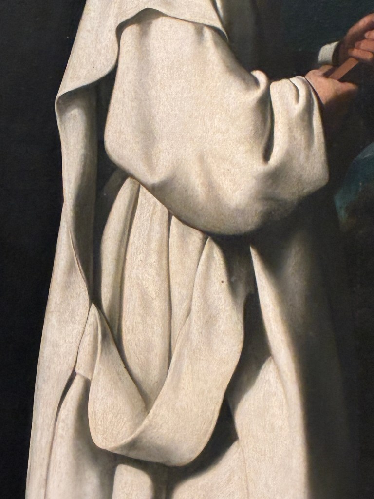 Il faut décaler son regard, des visages aux tuniques blanches des frères. Le peintre exerce son talent de coloriste, teintant les tissus plissés de gris, d’ocre et de variations nacrées. Un grand peintre est celui qui sait peindre des vêtements ! Et, juste à côté de la salle Zurbarán, on se convaincra de cette affirmation en contemplant une copie de la Virgen de la faja de Murillo.