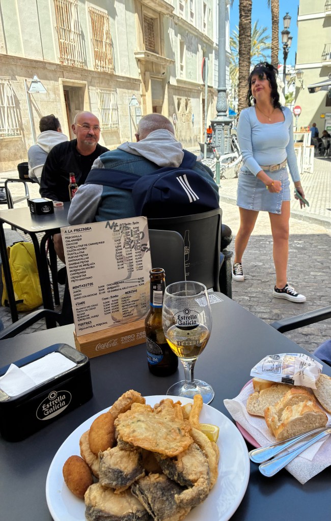 Sur la terrasse triangulaire du Nuevo Folgar, les prix sont extraordinairement doux, les clients du coin et les portions généreuses. Ainsi, en ce jour de Pâques lumineux de 2026, où les habitués se pressaient à l’intérieur pour goûter le riz maison, nous fûmes gratifiés pour 15 euros d’un frito gaditano avec de gros morceaux de poissons d’une extrême fraîcheur (entre autres chien de mer et colin), ainsi que des calamars, une tortillita de camarón, un beignet de crevettes grises et des croquettes de crevettes à l’ail. À 200 mètres de là, on payera le double dans des établissements plus touristiques.