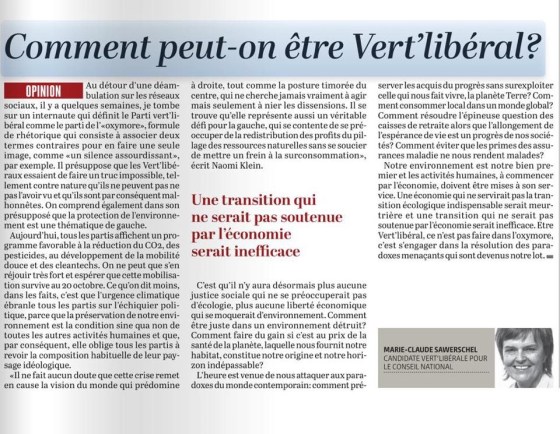 L’ancienne Chaux-de-Fonnière Marie-Claude Sawerschel, professeur de philosophie et ex(?)-directrice de lycée à Genève, est candidate verte libérale au Conseil national. … Plus