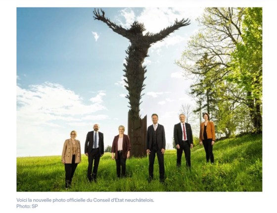 Quatre jours après Pentecôte, le gouvernement neuchâtelois a publié sa photo officielle 2023-2024. Cinq petits ministres devant un immense Christ…